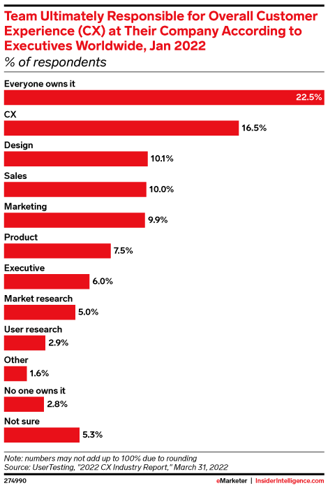 You can’t be customer centric without obsessively focusing on customer experience, yet only 16.5% of companies have dedicated CX teams, per recent data from eMarketer. It’s one thing to prioritize customer experience, but without someone to lead the initiative, it can be difficult (or impossible) to enforce a customer-centric business strategy and monitor customer experience across all departments.