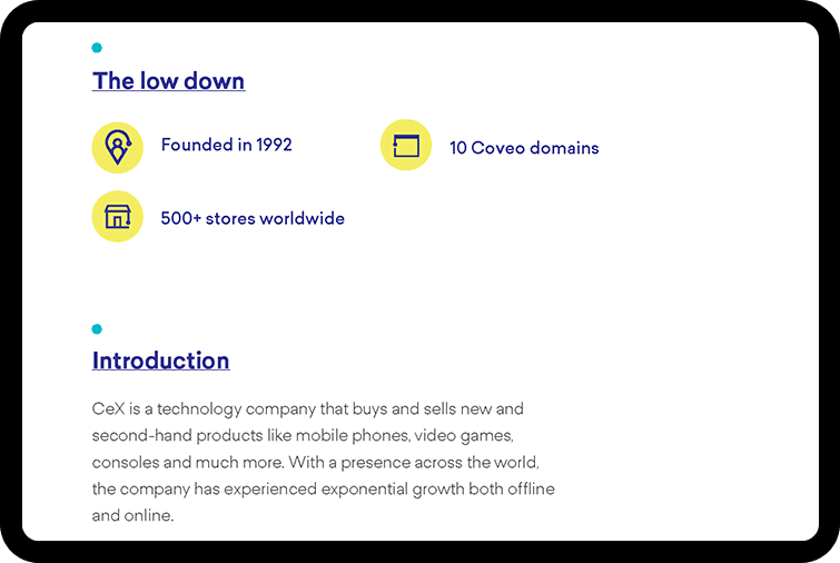 CeX partnered with Coveo in 2014 to build customer-centric experiences that not only help shoppers buy what they need, they also inform gaming habits and help build a sense of community. With 10 global domains, the company had to build something that was relevant to gamers and was able to scale quickly. Coveo’s powerful personalization tools included social proof, abandonment recovery, visitor pulse, and enhanced product recommendations.