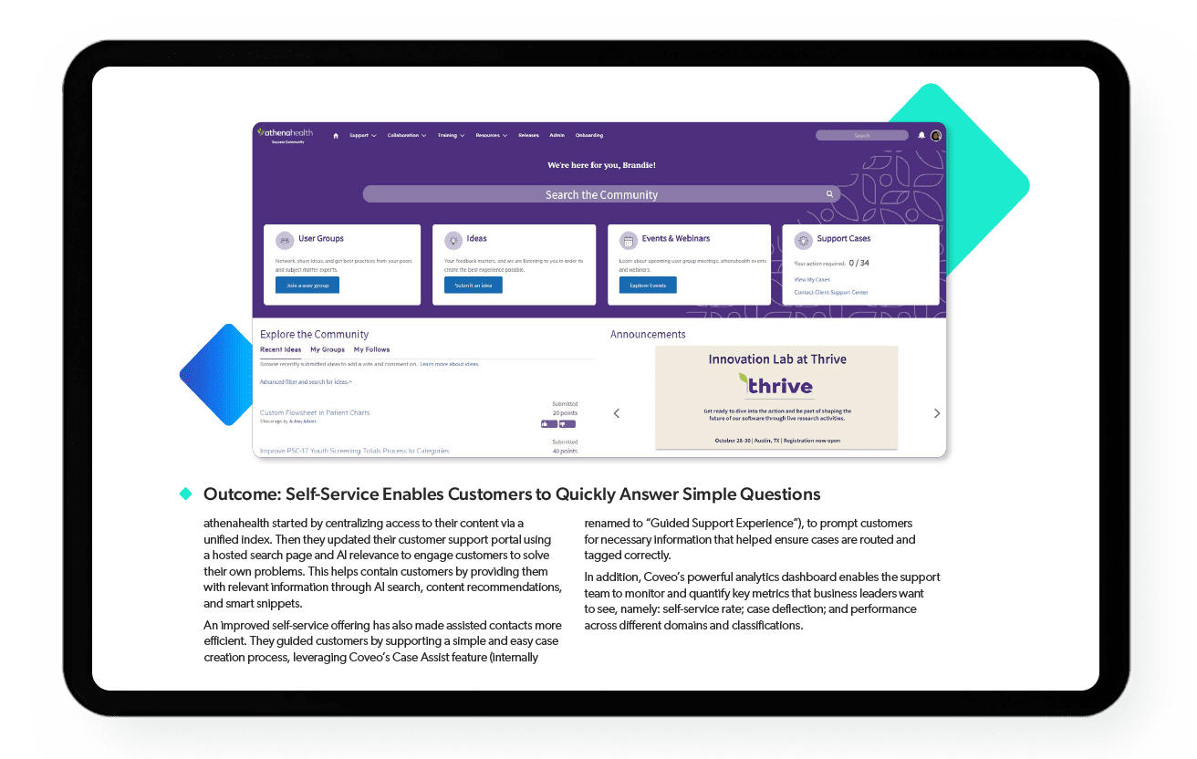 athenahealth’s transition to a unified knowledge base integrated the wisdom found in seven siloed systems, including Microsoft SharePoint and their own homegrown platform, into one. This empowered agents to do a single, manual search for the resources most likely to address their needs. Now athenahealth is experiencing an over 75% increase in resolution discovery.