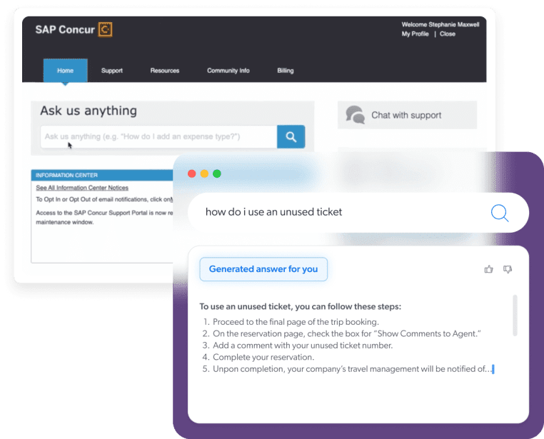 With Coveo’s AI-driven search engine, SAP Concur created a unified search experience for both customers and agents that accesses knowledge from across the enterprise. Additionally, implementing key AI-powered features such as generative answering, customer and employees receive quick, secure and accurate answers that reduce cases and build trust.
