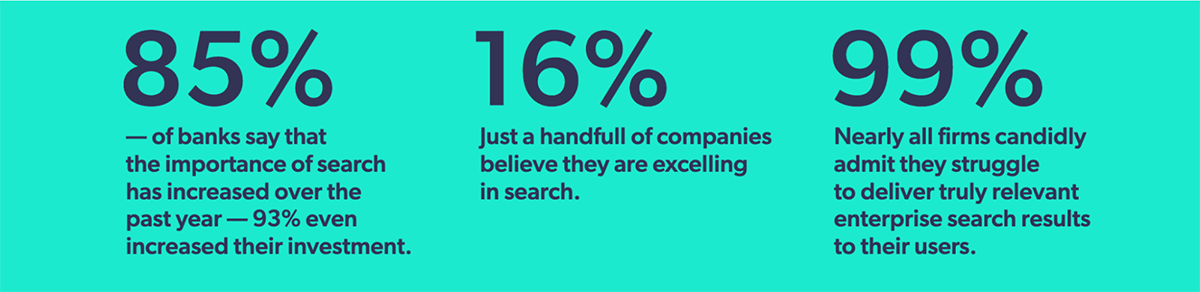 In a survey of 100 self-identified financial services enterprise search tech professionals, 85% of banks say that the importance of search has increased over the past year, with 93% even increasing their investment. But just 16% of companies believe they are excelling in search.