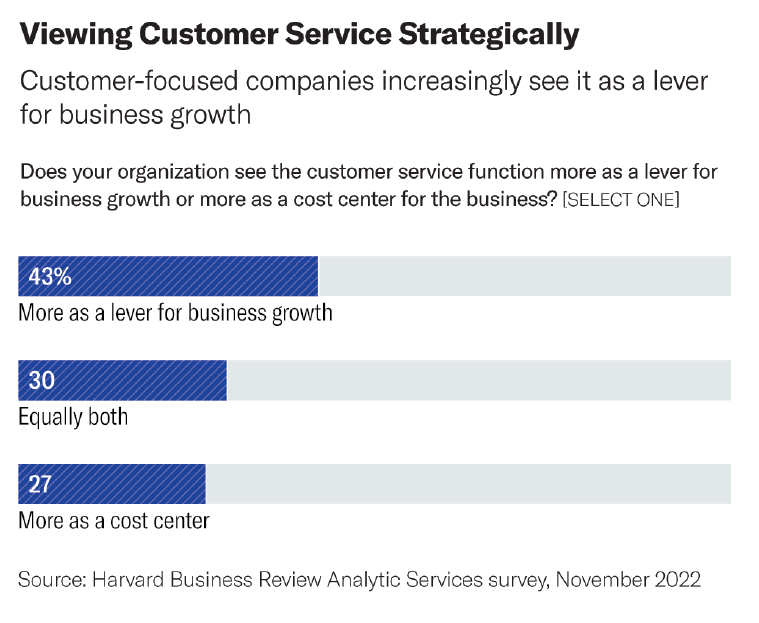 The proof is in the numbers. In a recent Harvard Business Review (HBR) Pulse report, commissioned by Coveo, executives understand that the traditional perception of customer service as a cost center is changing. Forty-three percent say their organizations view customer service as a strategic lever for business growth, as opposed to simply being a cost center (only 27%). Nearly one-third (30%) say their organization views customer service as an equal combination of both.