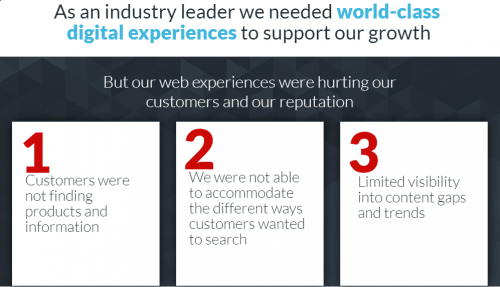 Internal research revealed that their customers are also using search as the first step in the journey, and it should be a priority to be simplified and streamlined. After conducting more extensive research with their website users, the team uncovered three major issues.