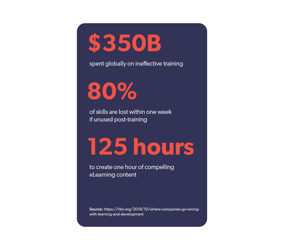- Employees lose 80% of skills within a week if they don’t use them post-training