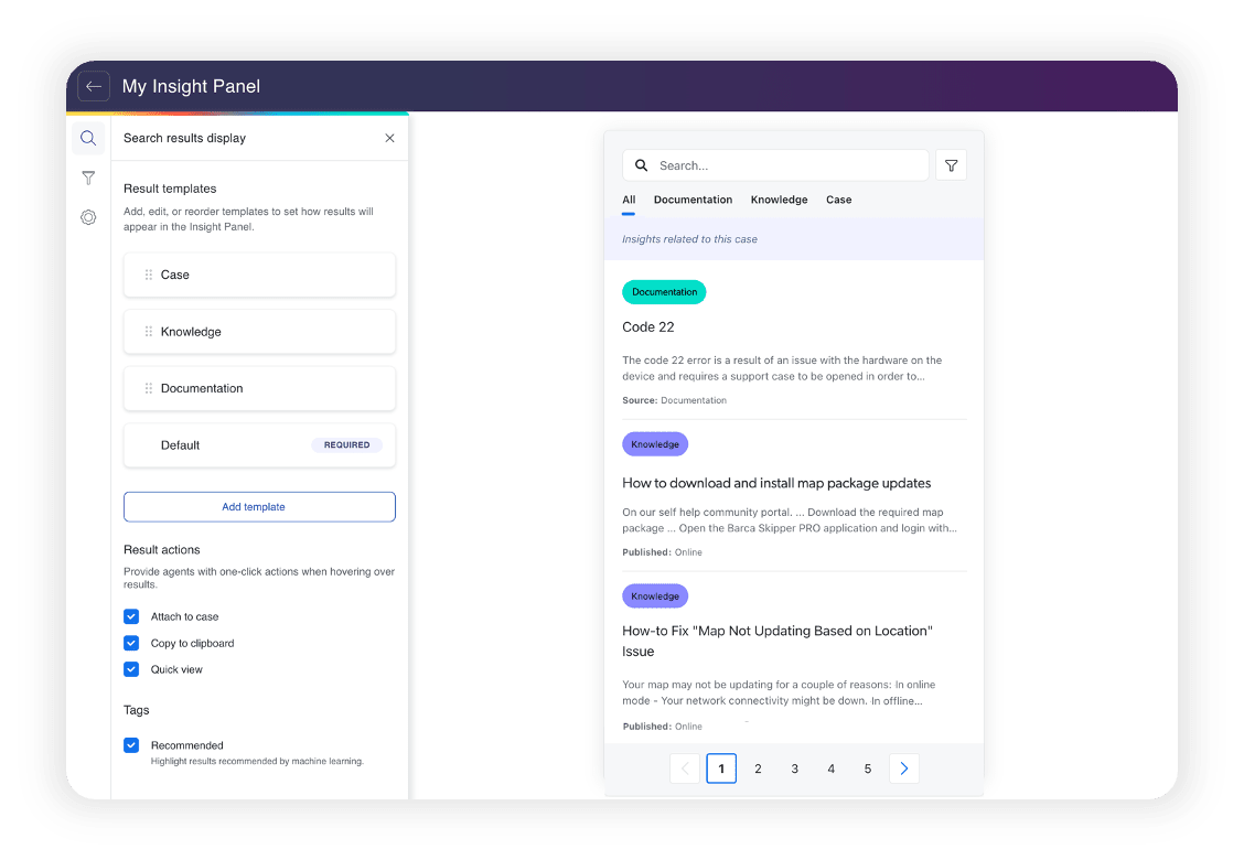 Because there are countless use cases for the Hosted Insight Panel, let’s walk through a typical example. Let’s say you want to add the case number to the search result template. In the past, you might have waited one, two, or even three months to realize this change, which would require the following steps: