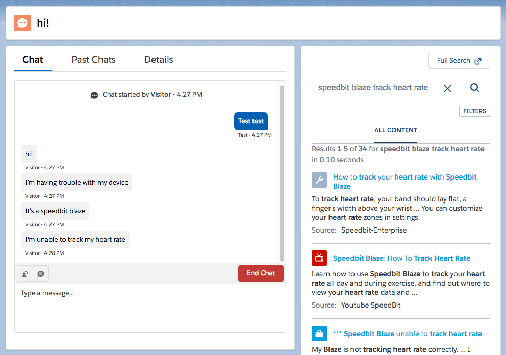 With Coveo integrated in Salesforce Live Agent, support agents can easily access shared and secured content from multiple disparate systems in a single unified search interface. They don’t have to manage multiple external sources in separate browser tabs, or navigate away from their chat to find what they need. It keeps agents focused on the customer and working in Salesforce, and provides them with relevant information they need, but more importantly, when they need it.