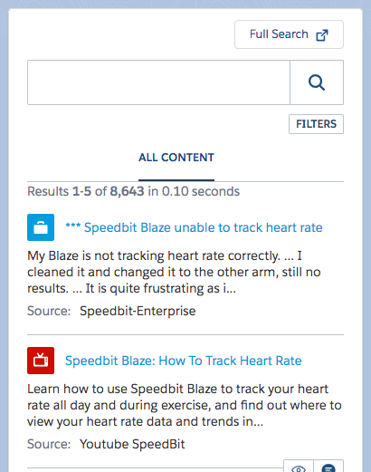 With Coveo integrated in Salesforce Live Agent, support agents can easily access shared and secured content from multiple disparate systems in a single unified search interface. They don’t have to manage multiple external sources in separate browser tabs, or navigate away from their chat to find what they need. It keeps agents focused on the customer and working in Salesforce, and provides them with relevant information they need, but more importantly, when they need it.