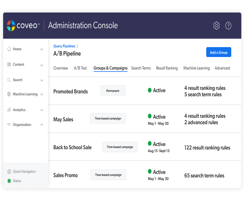 The Coveo Relevancy Platform provides businesses with no-code required methods to promote, build new relevancy AI models, and align terminology (synonyms) across the various product lines.