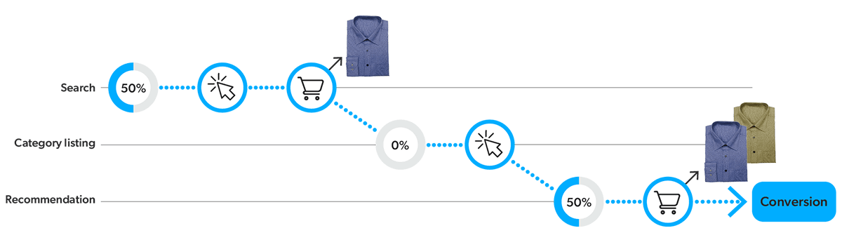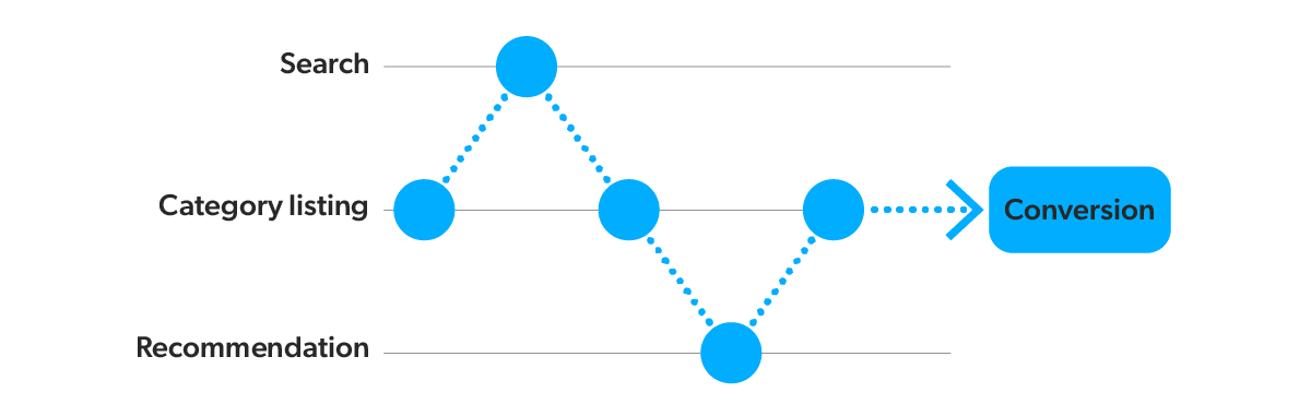 Customers engage with ecommerce websites across several touch points, and a single conversion event typically stems from a mix of interactions with search, category listings, and product recommendations.