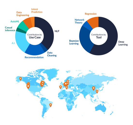 In the graphic below, we break down (with the help of our fantastic creative team) all initiatives by use case, tool and geographic distribution. While we did indeed travel far less than expected (given the map), we ended up producing results across a wide variety of use cases. This started with the “obvious” Natural Language Processing and Recommendation, and moved to more exotic topics, like Causal Inference and Intent Prediction.