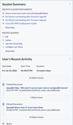 This integration brings the User Actions panel into the new agent workspace UI as well. As a reminder, the User Actions functionality was introduced in our last release to solve a common pain. It provides your support or service agents with insight into actions performed by both customers and employees on your website or portal – viewed searches, clicks and more – and brings together the browsing journey from beginning to end.