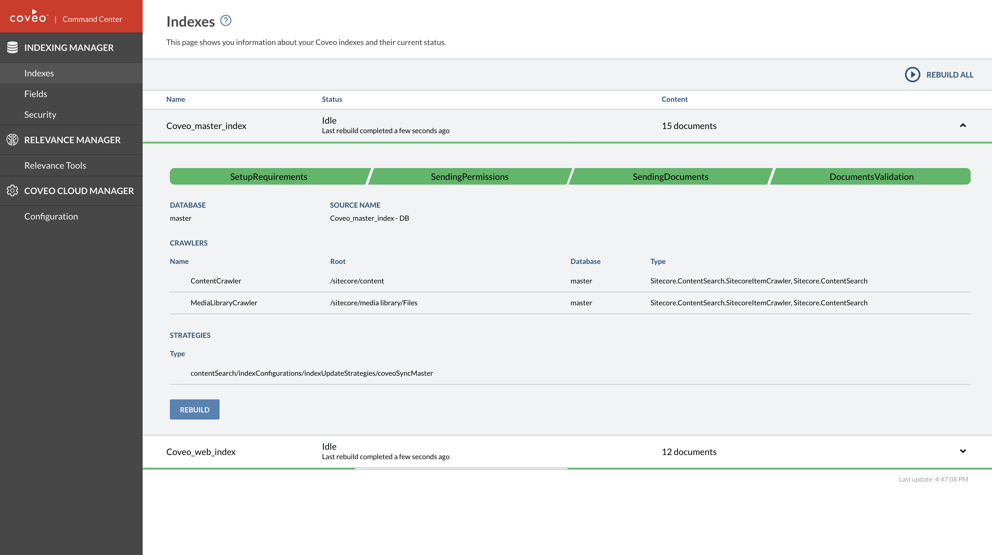 This new piece of the Coveo for Sitecore software includes the Coveo indexing manager, which allows you to start and closely monitor the indexing process to see exactly what’s happening at every stage.