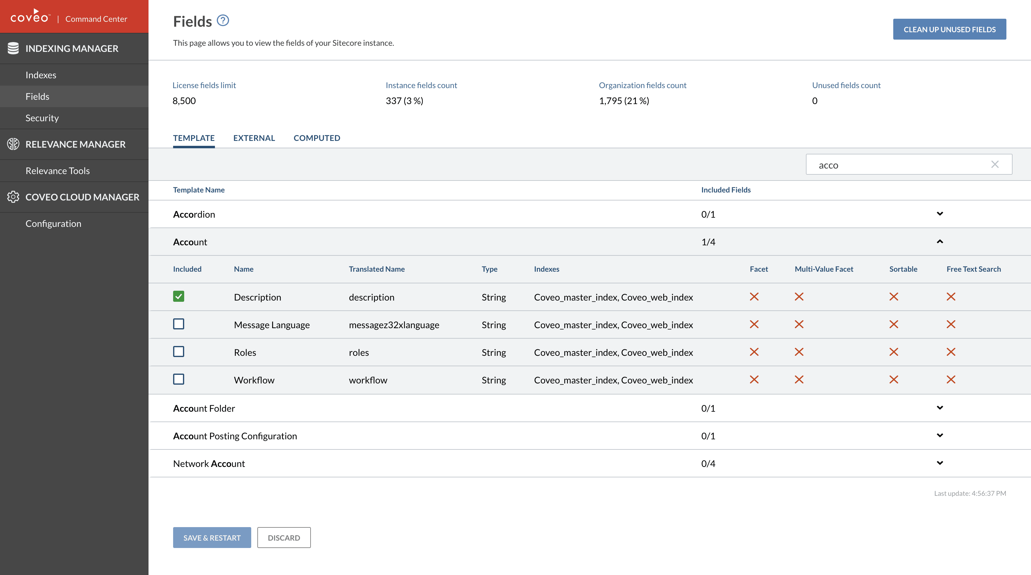 The previous indexing process was a bit vague for newcomers and veterans alike. The Sitecore Indexing Manager did not offer much when it comes to feedback, which meant that users had to dig into logs to find the relevant information. Field management was done in the configuration files, forcing users to require server access for every field inclusion and exclusion.The Coveo for Sitecore Command Center centralizes all configurations related to indexing, field management and cloud communication actions in one comprehensive user interface embedded in Sitecore.