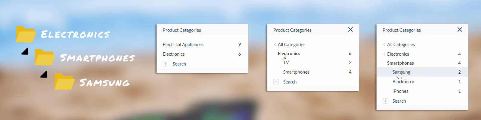 For example, by selecting “tablet in Computers and Tablets” from a global search box, customers will be redirected to the main search interface where the “Computers and Tablets” value is pre-selected in a product category facet.