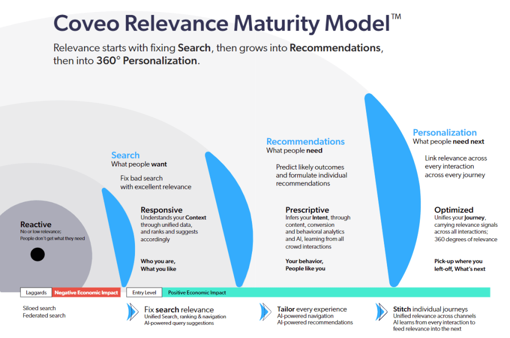 As shown above, organizations with siloed and federated search are reactive. In the CRMM™, these are referred to as Relevance Laggards. Laggards typically fall short of consumer expectations and actually have a negative economic impact on the organization. Organizations at this level should aim to at least become more responsive to their user’s needs by fixing search, to start with.