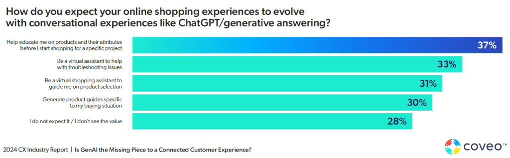 - Proactive Assistance: AI-powered virtual assistants can provide proactive assistance by guiding customers through their buying journey, helping with product selection and troubleshooting issues. As 72% of respondents said they expect digital experiences to evolve with trends like generative AI, this is an actionable way to differentiate and exceed expectations.