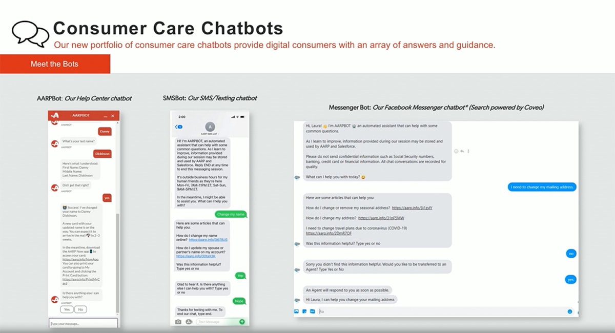 Organizations like AARP have embedded chatbots in various channels on their help sites. The bots use Coveo to leverage the knowledge and retrieve relevant and high value content.