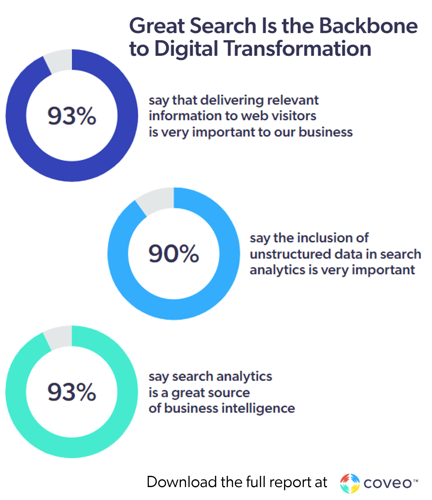 According to a survey of 600 IT professionals, 84% see search as critical to driving digital transformation. If nothing else, strong enterprise search supports the delivery of relevant information to web visitors, something 94% of respondents say is very important to their business.