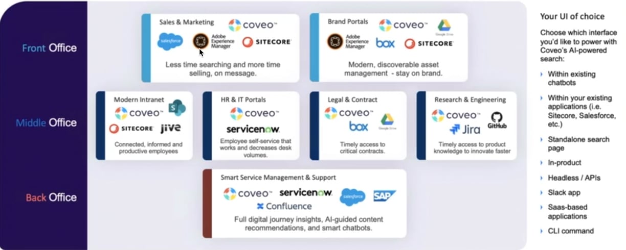 - Conversational and generative AI (GenAI) to leverage models to generate answers (for example, Coveo Relevance Generative Answering)