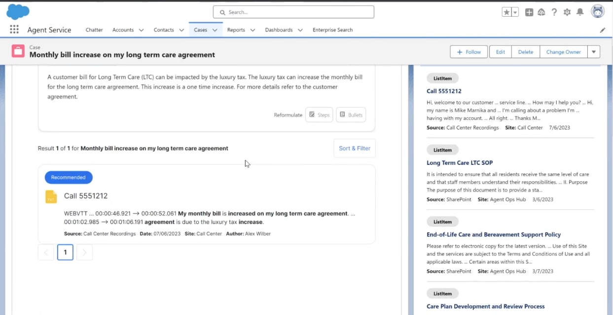Depending on the available recordings and case context, the agent may be able to glean a solution from the recommended search result. If needed, they can drill down into the call recording to see the agent’s notes, read the transcript, and even listen to the actual call — all within their present agent view in Salesforce.