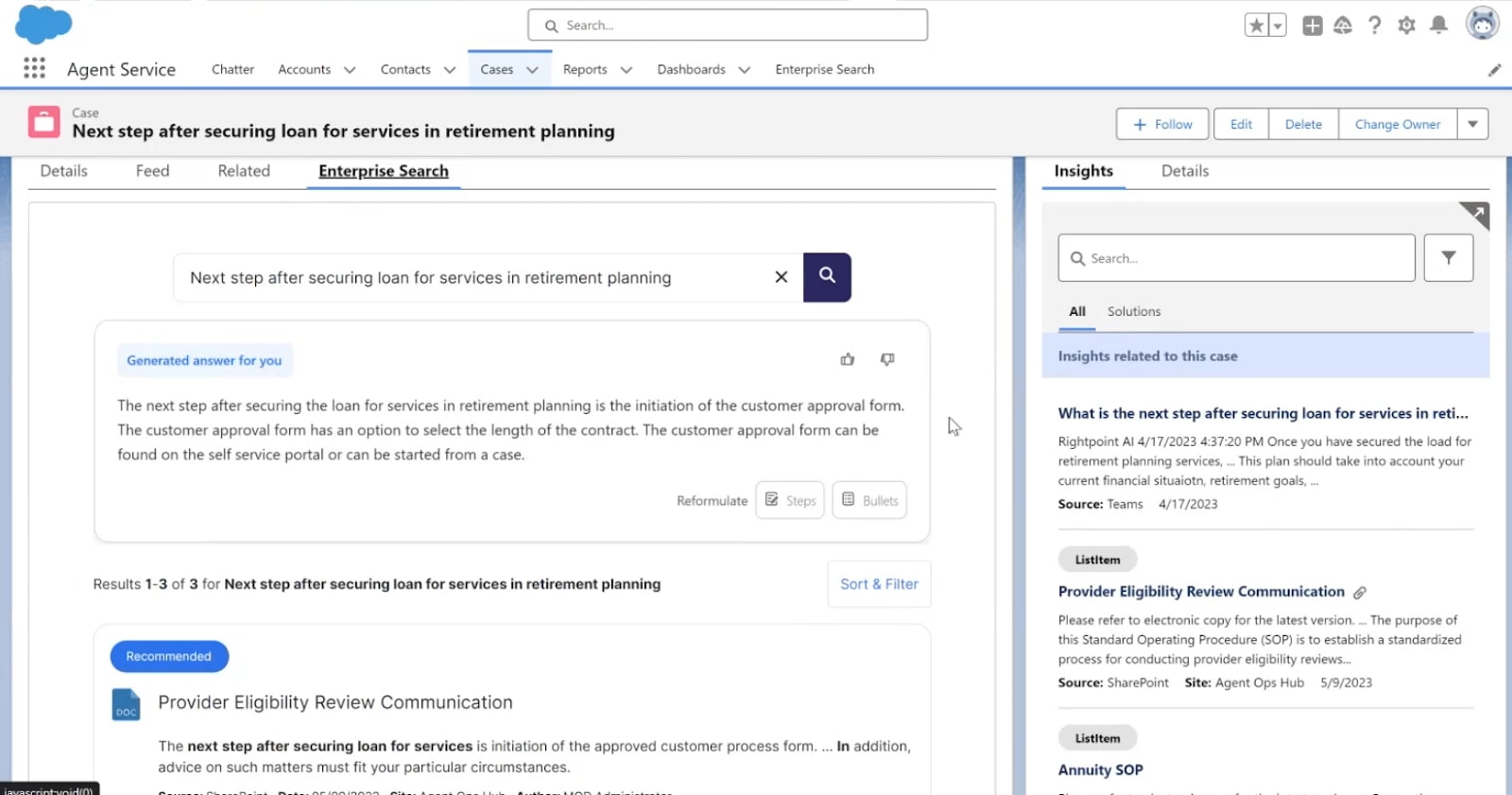 The agent can also switch to enterprise search, which automatically runs a query based on that same case context to generate a viable answer. Instead of having to look through a SOP document that’s 80 pages long, then craft a response, the agent can rely on GenAI to do it for them.