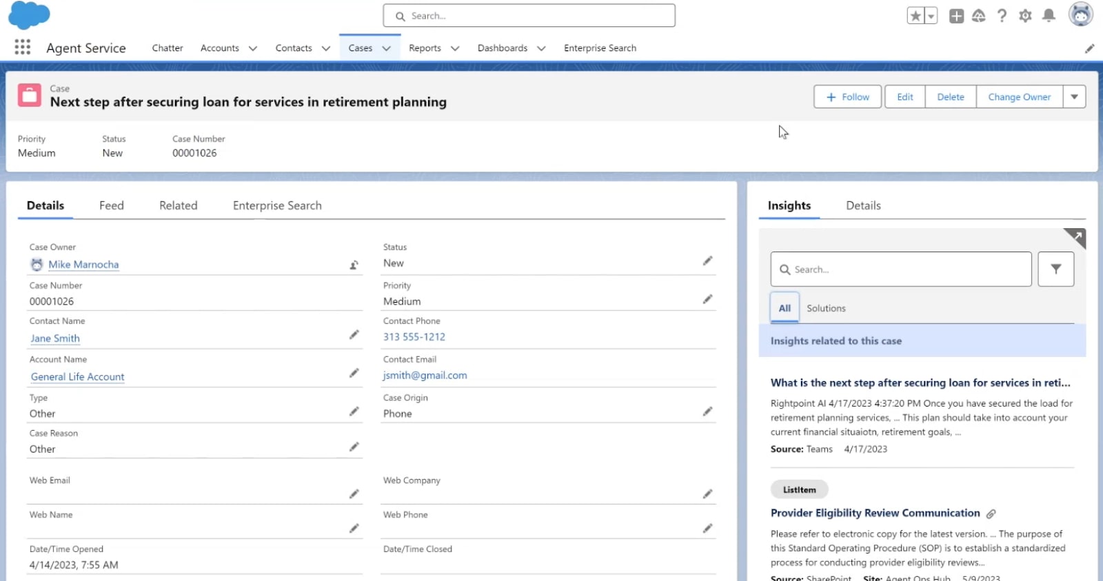 Suppose the same agent working in Salesforce has no luck with the Insights Panel or enterprise search (a rare occurrence, but it happens).