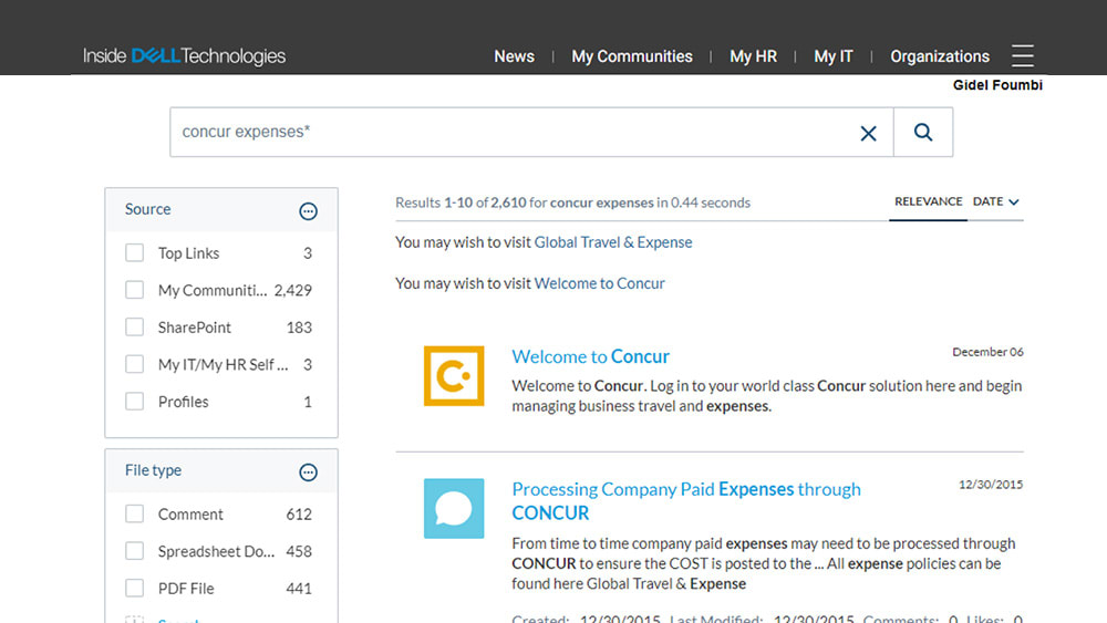 Facet fields give the employee a way to narrow the results of internal documents, external media links, and actual forms they might want to fill out. Naming the appropriate facets is key here, but so is making sure there’s no penalty for clicking on the wrong facet. If they decide it’s not the right facet field, they should be able to easily deselect to go to where they were before.