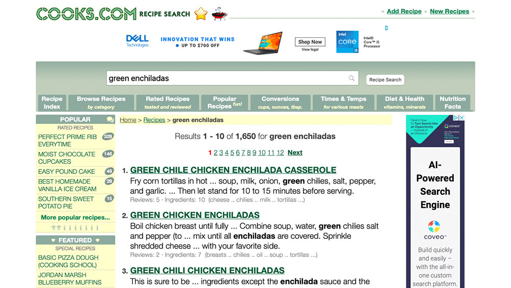 Nielsen Norman Group (NNG) uses the below example of Cooks.com to illustrate how filters differ from facets. A search for green enchiladas turns up over a thousand results, but unless ‘healthy’ is in the recipe’s title, there’s no way to add additional filters to further refine the results.
