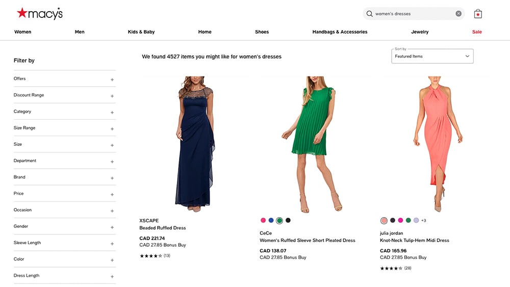 Faceted navigation brings these concepts together to tap into the power of search, while easing the burden on searchers. If I search for “women’s dresses” on Macy’s website, faceted search allows me to narrow results using multiple facets to get to the product I’m looking for.