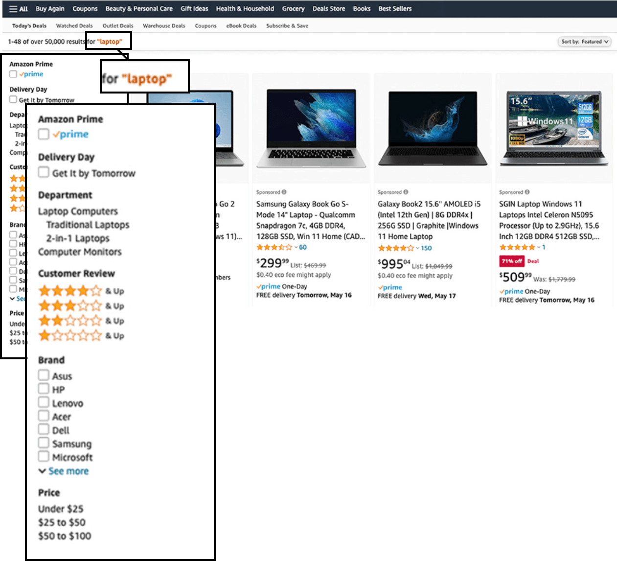 In the below example, Amazon is helping customers narrow the results and access the most relevant and optimal product by using sensible faceted classification.