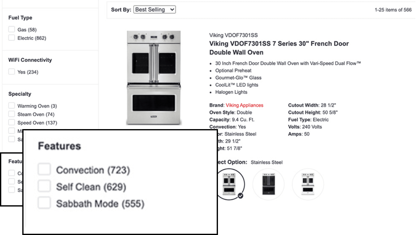 Facets provide a great opportunity to educate customers about the range of features and attributes that are most relevant to the specific domain and query. For example, not everyone who shops for a refrigerator is even aware of a Sabbath mode option that would be Sabbath-compliant. By adding this facet, it brings awareness to the product options available.