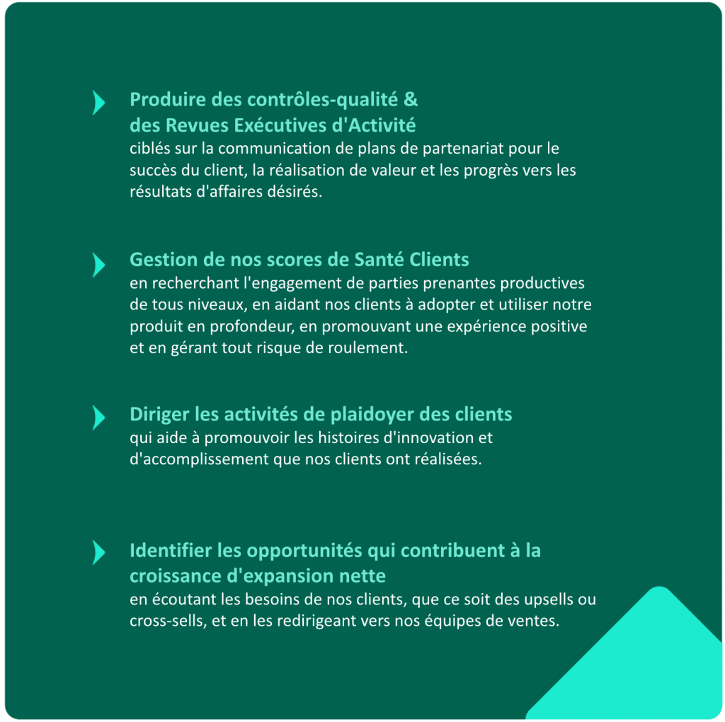 Les responsabilités des gestionnaires de réussite client dans l’ensemble de l’industrie peuvent souvent couvrir de nombreux domaines différents, notamment :