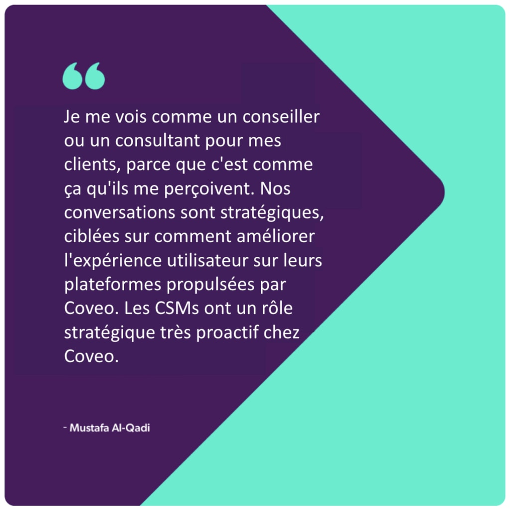 Alors que j’examinais les différentes options pour ma prochaine étape de carrière, je cherchais un endroit qui correspondait aux fondamentaux de la réussite client et qui investissait dans ce département. À l’époque, Coveo avait déjà développé un Indice de Santé Client composé de 10 différentes mesures, était bien avancée dans la mise en œuvre de Gainsight, avait établi une matrice de responsabilités principales et mesuré les objectifs de leurs CSMs. Tout ceci servait à définir le succès pour leurs équipes et, en fin de compte, pour leurs clients.