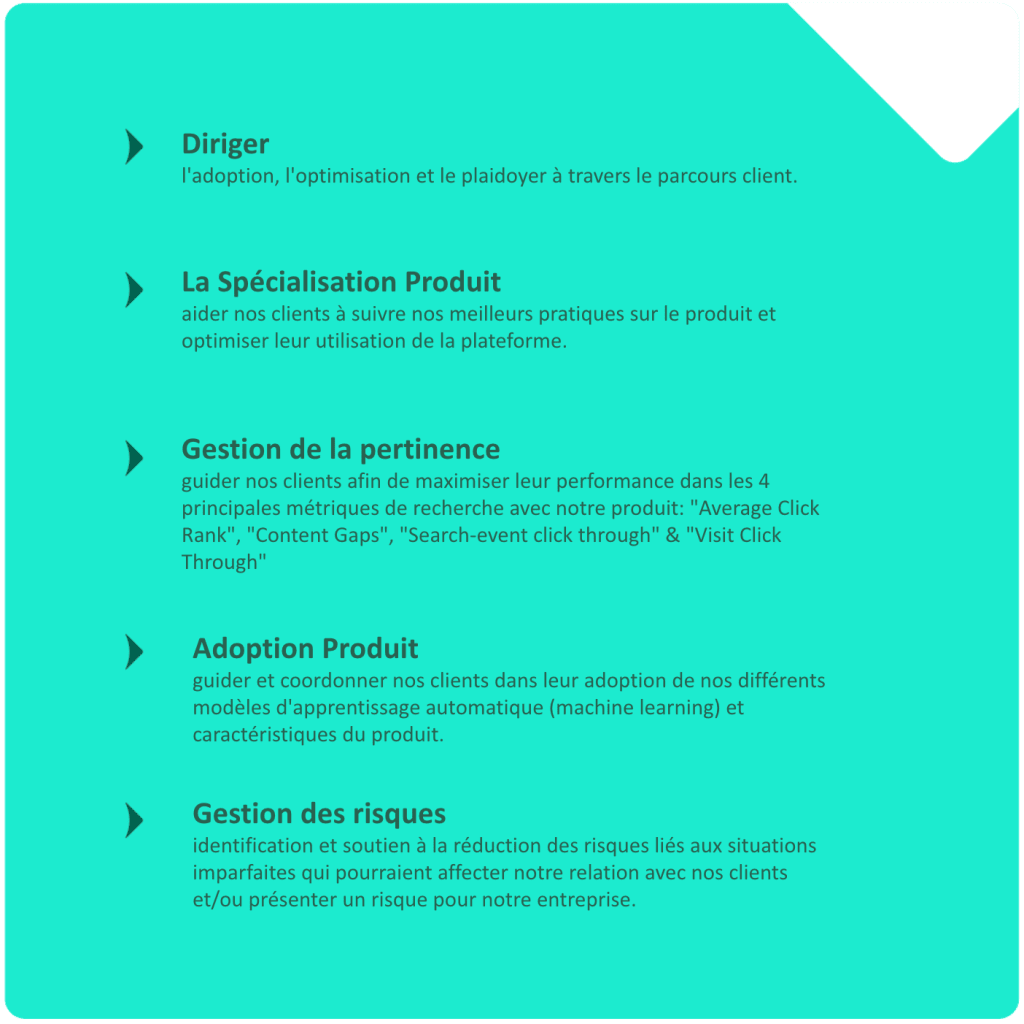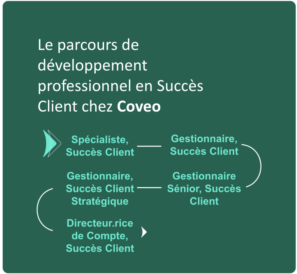 Coveo propose également 5, oui CINQ, positions le long de leur parcours professionnel en réussite client, ce qui permet d’offrir des opportunités de développement de carrière pour les CSMs :