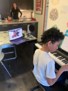 Le fils de Neldy Germain, Knox, prend des cours de piano en ligne
