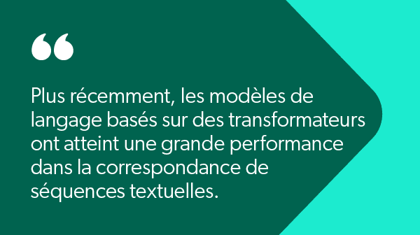 Plus récemment, les modèles de langage basés sur des transformateurs ont atteint une grande performance dans la correspondance de séquences textuelles. Le problème est que ces modèles sont coûteux en termes de calcul et nécessitent des unités de traitement graphique (GPU) très efficaces. Ces restrictions rendent indispensable le développement de modèles évolutifs et efficaces en fonction de certaines mesures de performance.