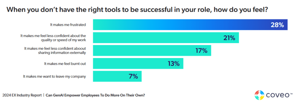 Finding information in real-time quickly is crucial to improving employee experience. In Coveo’s 2024 EX Industry Report, about a third of workers we surveyed said that not having the right tools is frustrating and that they feel less confident in their quality of work, and thus less apt to share information externally.