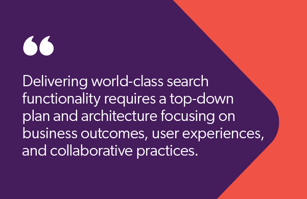 To accomplish all this, technology teams must select smarter, faster, and more innovative ways to plan, implement, establish feedback loops, and enhance search capabilities. Delivering world-class search functionality requires a top-down plan and architecture focusing on business outcomes, user experiences, and collaborative practices.