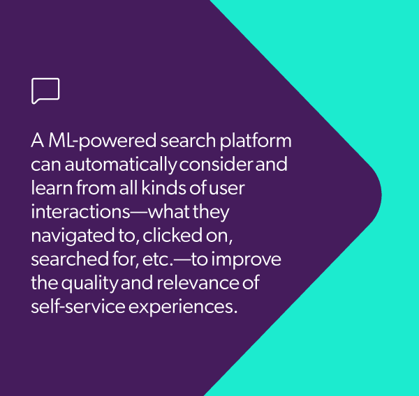 In the end, a ML-powered search platform can automatically consider and learn from all kinds of user interactions—what they navigated to, clicked on, searched for, etc.—to improve the quality and relevance of self-service experiences.