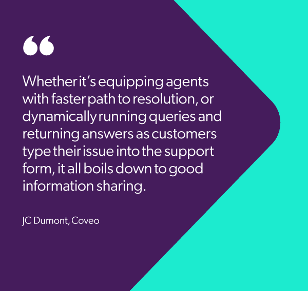 “Whether it’s equipping agents with faster path to resolution,” says Dumont, “or dynamically running queries and returning answers as customers type their issue into the support form, it all boils down to good information sharing.” The challenge is doing all of this at scale.