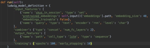Ludwig is easy to use – to provide a complete, “stateless” and self-contained pipeline, we wrap prod2vec training, dataset preparation and Ludwig APIs in a Luigi pipeline. The magic happens in the model definition, where a simple dictionary with options is passed to initialize the class: