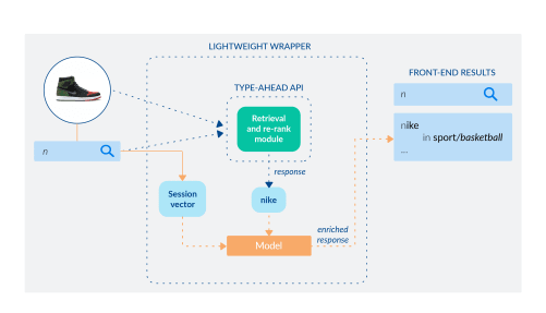 As the user starts typing, say, the letter n, the session context (that is, the products the shopper interacted with in the session) and the prefix n are sent to the type-ahead API. The service retrieves candidates (e.g. nike, nba jersey, nba shoes, lebron shoes, etc.) and re-ranks them (first nike, then nba shoes, etc.) with some logic to produce a final list that is returned back to the shopper in the dropdown menu. To improve upon this with our personalized model, we can keep the basic API the same (internally) and wrap it around a lightweight structure: