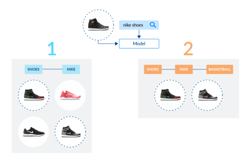 - an “aggressive” prediction: shoes > nike > basketball: the model nudges the user into a very specific section of the catalog, by placing “a bet” on a specific sport interest.