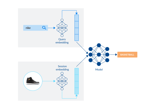 At its core, category prediction combines dense representation of the candidate suggestion (“nike”) with a dense representation of the shopper session (interaction with basketball shoes) to produce a prediction (basketball).