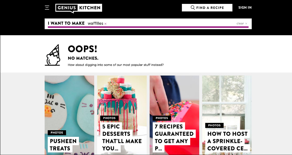 Don’t let users get to a “dead end” of no results on your website. “No results” is a clear invitation to go over to an external search solution; i.e., your competitor. Avoid losing your users by finding other ways to engage them on your results pages, like providing internal links to a “contact us” email address, FAQ page, or the customer service line.