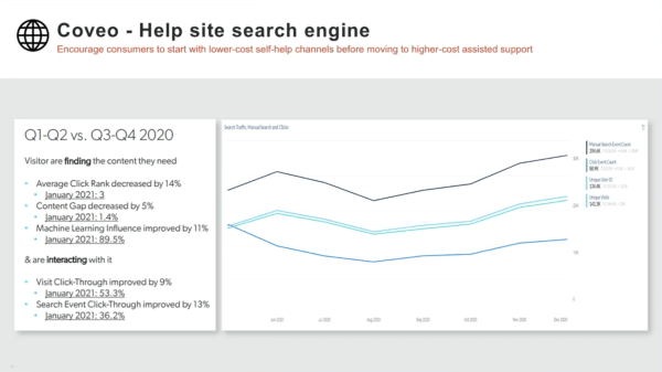 Indeed, help form case creation has plummeted overall since implementing Coveo and refining AARP’s help site content. “Machine learning influence shows us how our Coveo-powered system is learning how people ask questions, taking that [data], and constantly building on itself.”