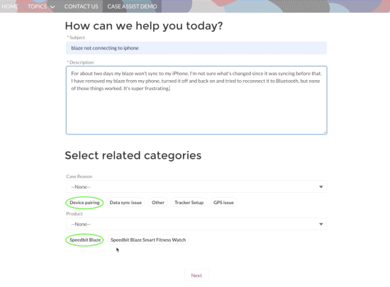 One of the sticking points customers run into on help forms is not understanding how to categorize their cases. Often, this is a result of forms that dictate available options to the customer, instead of the other way around. Coveo Case Assist does it with Intelligent Case Classification, which lets customers describe the issue in their own words first. Only then does the system automatically suggest classifications based on the case details filled in by the customer — right there on the form.