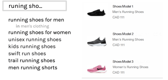 Typo-tolerant, predictive and categorized query suggestions can help buyers formulate and refine queries as well as offer immediate feedback on their queries with a preview of the results they’ll see on the search results page. Query suggestions go far beyond offering a generalized category to explore, such as “running shoes”, and instead ensure that a variety of relevant suggestions are offered to each individual buyer.