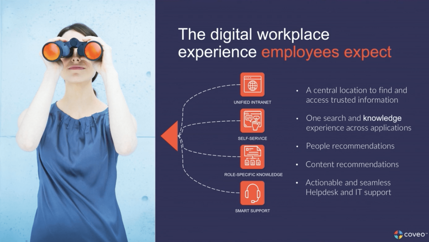 So what makes for a good employee experience? We can answer this with one word: findability. Employees expect to be able to find information they need to do their jobs. And in the spirit of “there’s an app for that,” there’s certainly no shortage of digital workplace tools designed to solve all kinds of problems revolving around content and data.