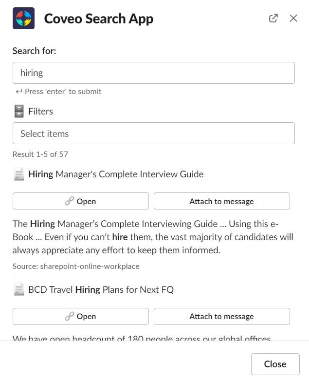 Often, people want to search their external content stored in places like Jira, Confluence, Sharepoint Online from within an application like Slack. Slack offers integration with custom applications, but getting content from multiple sources can be a burden. That is where Coveo comes in. Coveo already has connectors to index the content. During indexing, document-level security is also stored, which makes it possible to only show the results which a specific end-user is allowed to see.